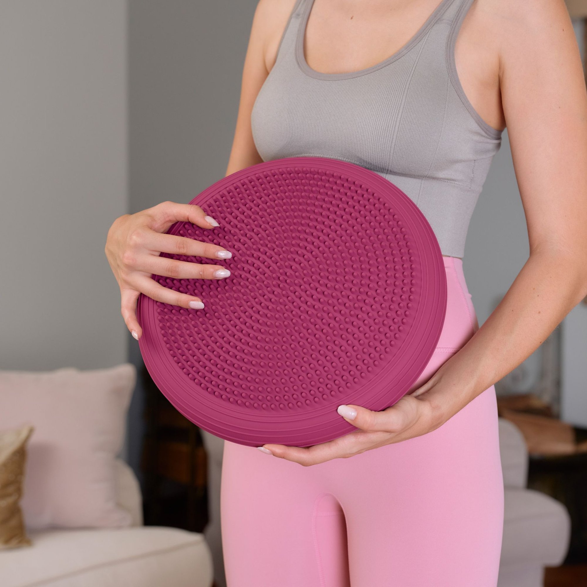 Aan de ene kant van het balanskussen zitten nopjes, aan de andere kant is het oppervlak glad. Je kiest zelf welke zijde je gebruikt. De nopjes zorgen voor een massage-effect en stimuleren de bloedsomloop tijdens oefeningen.