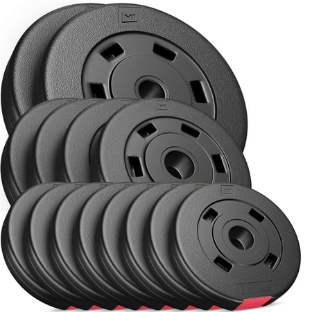 Gewichten van 30 kg (2x5 kg; 4x 2,5kg; 8x1,25 kg) van kunststof zijn geschikt voor zowel beginners in krachttraining als professionele sporters en zijn een waardevolle toevoeging aan jouw homegym.