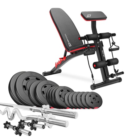 Compleet Set - Halterbank HS-1035 met 66 kg Kunststof Halterset met 1 x Super SZ-Curlstang 120 cm, 1 x Lange Halterstang 167 cm en 2 Korte Halterstangen, inclusief Stervormige Sluitingen.