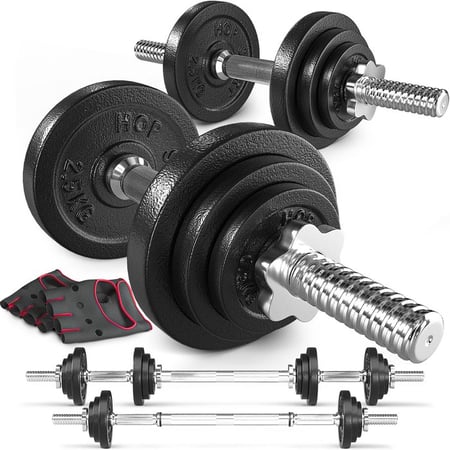 De halterset met gietijzeren gewichten 2 x 10 kg is meer dan een standaard trainingsapparaat. Dankzij de slimme constructie gebruik je het zowel als korte dumbbells als lange barbell – met behulp van de verbindingsstang. Deze barbell kun je op drie manieren beladen, wat jou een breed scala aan trainingsopties biedt: van roeien tot bankdrukken, deadliften en squats. De set bevat ook neopreen handschoenen die je handen beschermen tijdens intensieve sessies. De bijgeleverde gewichten kunnen bovendien flexibel met elkaar worden gecombineerd voor nog meer variatie.
