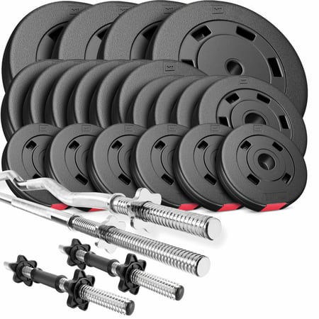 Kunststof Halterset 105 kg (4 x 10 kg, 6 x 5 kg, 4 x 2,5 kg, 6 x 1,25 kg) met Halterstangen Ø 30 mm: 2 x Korte Halterstang 45 cm, 1 x Lange Halterstang 167 cm en 1 x SZ-Curlstang 120 cm inclusief 8 Stervormige Sluitingen
