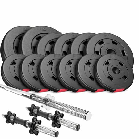 Kunststof Halterset 38 kg (2 x 5 kg, 4 x 2,5 kg, 6 x 1,25 kg) met Halterstangen Ø 30 mm: 2 x Korte Halterstang 45 cm en 1 x Lange Halterstang 167 cm inclusief 6 Stervormige Sluitingen