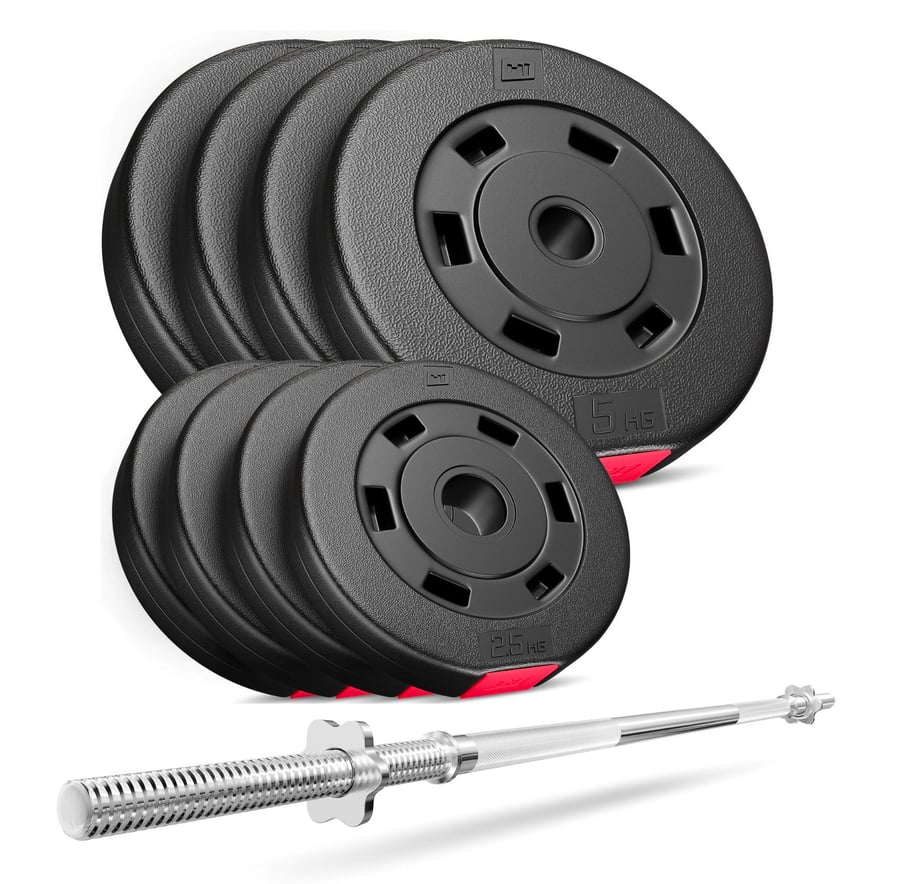 Kunststof Halterset 39 kg (4 x 5 kg; 4 x 2,5 kg) met Lange Halterstang 167 cm Ø 30 inclusief 2 stervormige sluitingen van metaal en Halterplaten met universele Boorgat 31 mm