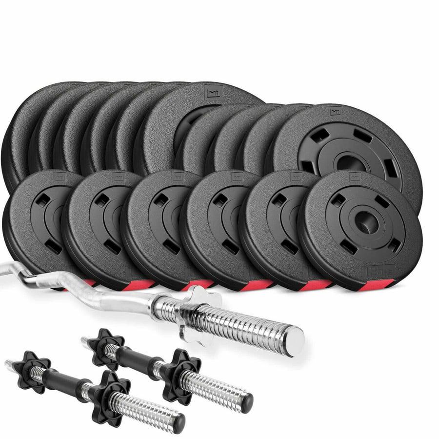 Kunststof Halterset 56 kg (6 x 5 kg, 4 x 2,5 kg, 6 x 1,25 kg) met Halterstangen Ø 30 mm: 2 x Halterstang 45 cm en 1 x SZ-Curlstang 120 cm inclusief 6 stervormige sluitingen