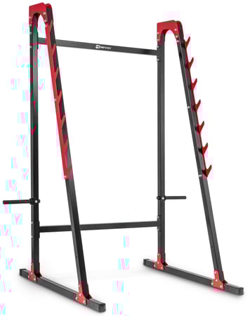 De halterhouder HS-1008L van Hop-Sport is een praktische trainingspartner voor squats met een halterstang. Dankzij de in hoogte verstelbare houders past het apparaat zich aan jouw lichaamslengte en oefeningen aan. De stevige constructie van 4 x 4 cm stalen buizen zorgt voor stabiliteit en veiligheid. Daarnaast beschikt het model over handige houders voor halterschijven, zodat jouw gewichten altijd netjes en binnen handbereik zijn opgeborgen. De kunststof voeten beschermen de vloer tegen krassen en voorkomen verschuiven van het rek. Inclusief montageset – direct klaar voor gebruik in jouw homegym.