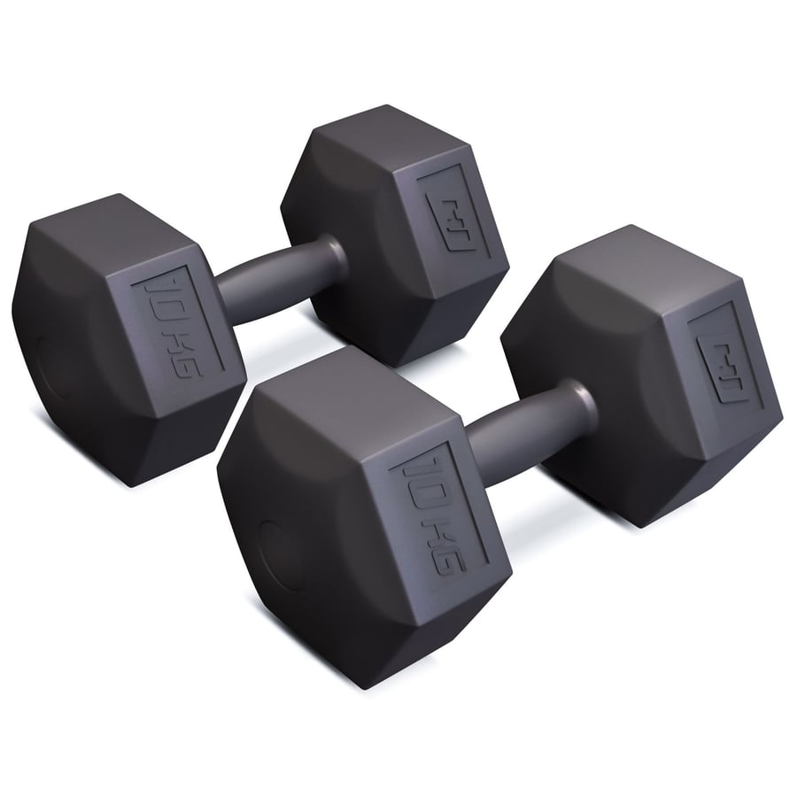 Een set van 2x10 kg halters van kunststof van Hop-Sport met een zeshoekige vorm voor maximaal comfort tijdens het gebruik.