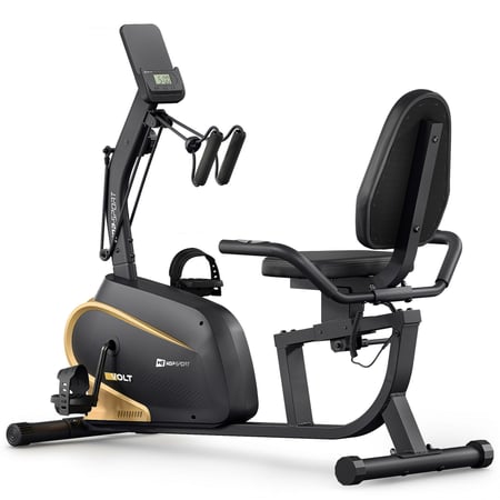 De ligfiets Hop-Sport HS-045L Volt biedt gewrichtsvriendelijke training met 10 weerstandsniveaus, hartslagsensoren, ergonomische zitplaats en expanders voor een effectieve full-body workout.