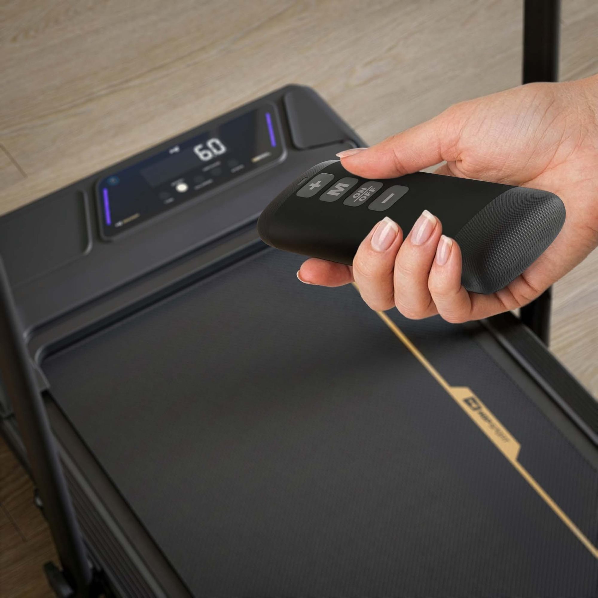 De bediening van de loopband is eenvoudig en flexibel: je kunt gebruikmaken van een handcontroller met houder of van het bedieningspaneel met smartphonehouder, dat bovendien inklapbaar is. Zo heb je alle instellingen altijd binnen handbereik.