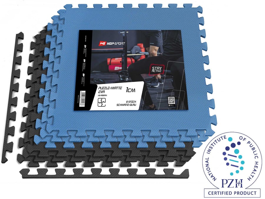 Puzzelmat van Hop-Sport, EVA 1cm - 6 stuks, vloermat voor fitnessruimte & fitnessapparatuur, waterafstotend, gecertificeerd product, gratis levering, zwart/blauw
