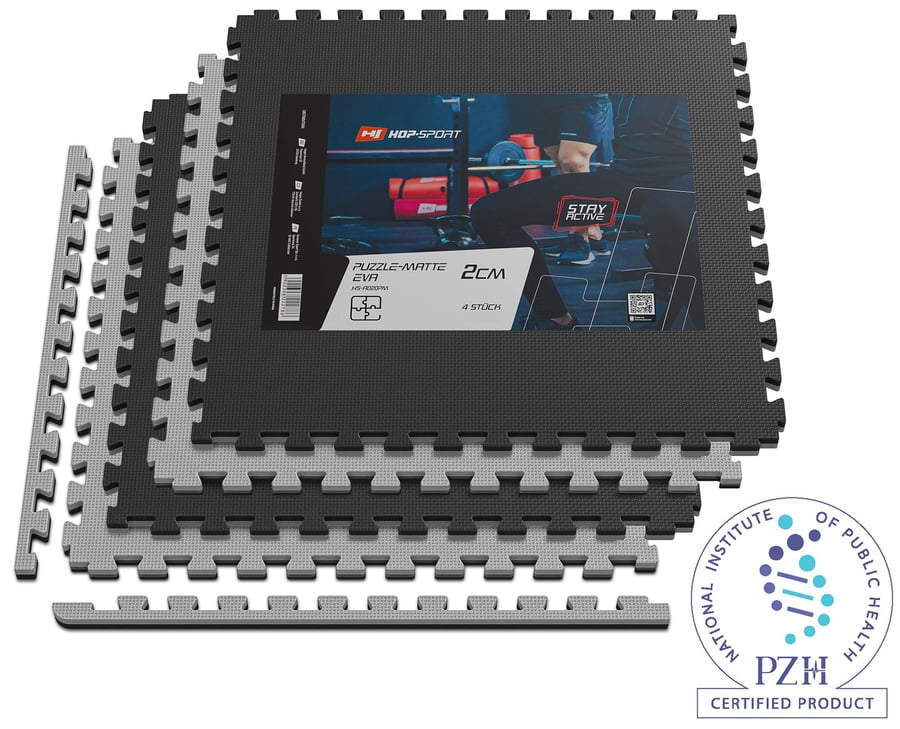 De Hop-Sport HS-A020PM puzzelmat met een dikte van 2 cm biedt betrouwbare bescherming voor vloeren van laminaat, hout en keramische tegels. Ze voorkomt krassen en vuil veroorzaakt door fitnessapparatuur of krachtaccessoires en zorgt voor extra stabiliteit van de toestellen die erop staan. Dankzij de stevige demping worden geluiden en trillingen tijdens intensieve trainingen aanzienlijk verminderd, waardoor je comfortabeler en veiliger kunt sporten zonder je vloer te belasten.