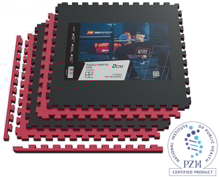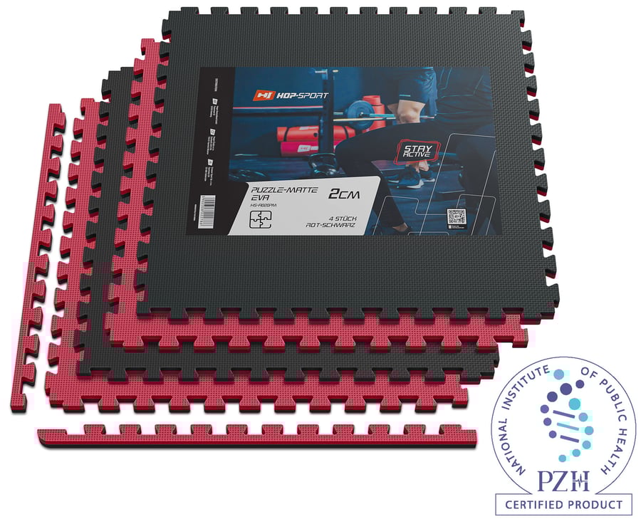 Extra dikke puzzelmat van Hop-Sport, 4 stuks met grote 60x60 cm platen, ideale vloerverdediging, waterafstotend en antislip, eenvoudig te combineren met andere sets, Zwart/Rood.
