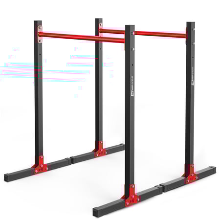 Met de Dip-Station HS-1011K presenteren we een krachttrainingsapparaat dat er onschuldig uitziet, maar veel te bieden heeft. De meegeleverde neopreen handschoenen zorgen ervoor dat je tijdens de training altijd alles stevig in de hand heeft. Het is ontwikkeld uit 2 onafhankelijke componenten, waardoor je de afstand tussen hen individueel kunt regelen. De handgrepen kunnen in 2 verschillende hoogtes worden ingesteld. De voeten van de dip-station zijn uitgerust met een brede basis, die stevig is vastgeschroefd aan het hoofdframe met speciale houders.