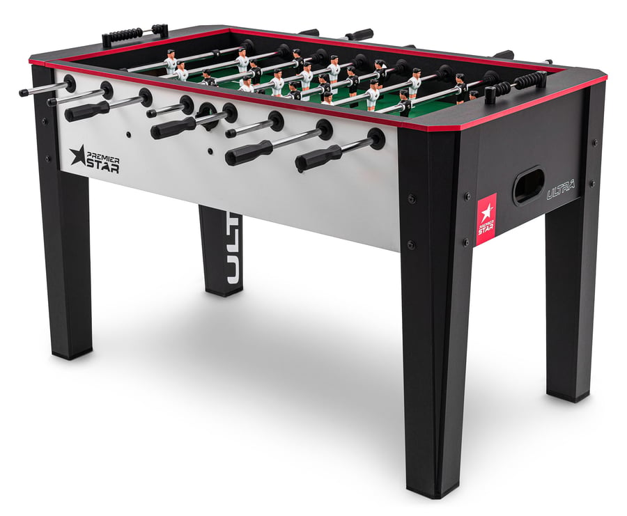 Deze tafel kenmerkt zich door zijn robuuste en tegelijkertijd elegante constructie. Zijn massieve poten geven de tafel de nodige stabiliteit bij elk nog zo intens voetbalspel. De verchroomde, volle stalen stangen, waarop de speelpoppen zijn gemonteerd, weerstaan de wildste en meest emotionele spellen. Door deze constructie zult u vele jaren plezier beleven aan deze tafel. De levering omvat 4 dozen, die alle noodzakelijke onderdelen inclusief een montagehandleiding bevatten, om de Tafelvoetbal Ultra snel zelf op te bouwen.