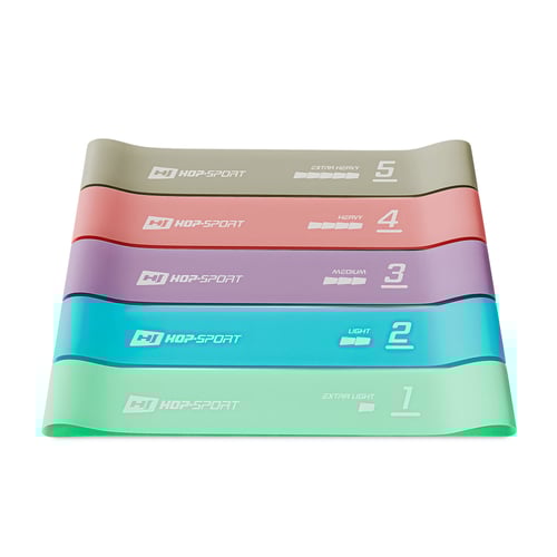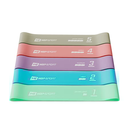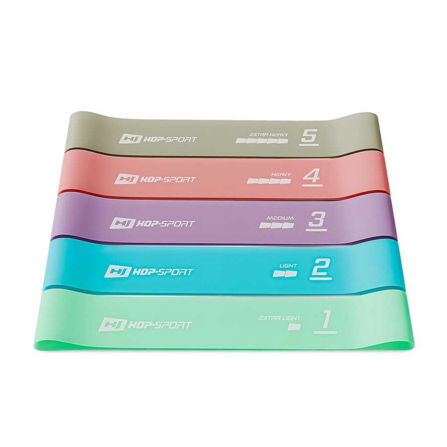 Elk van de vijf fitnessbanden HS-L650RLL biedt een ander weerstandsbereik - opeenvolgend van de lichtste naar de donkerste: 2,5-4,5 kg, 4,5-7 kg, 7-9 kg, 11-14 kg, 14-18 kg.