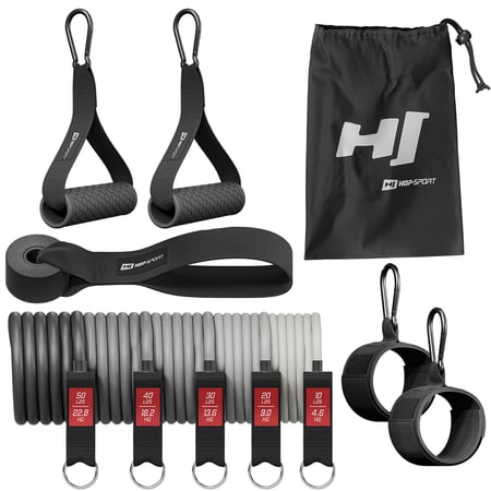 De set wordt compleet geleverd met 2 handgrepen, 2 enkelbanden, een deuranker en een praktische opbergtas, zodat je overal comfortabel en effectief kunt trainen.