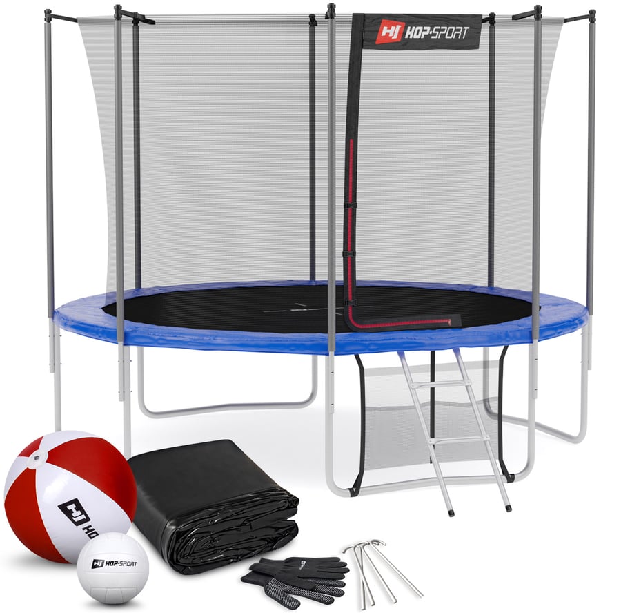 Tuintrampoline 10FT - 305 cm Binnennet van Hop Sport met INTERTEK-certificaat, hoogste kwaliteit incl. ladder, regenhoes, grondhaken, schoenentas en montagehandschoenen, blauw