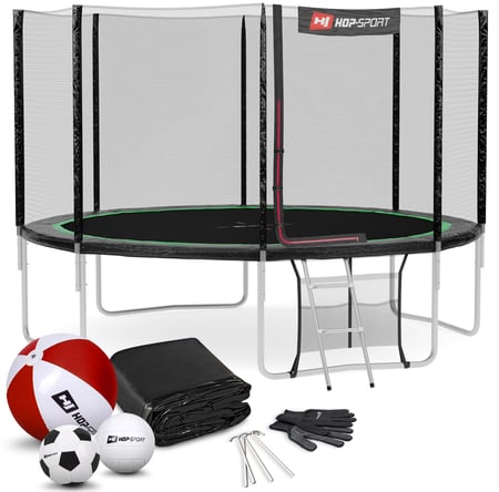 Tuintrampoline 12FT - 366 cm Buitennet van Hop Sport met INTERTEK-certificaat, hoogste kwaliteit incl. ladder, regenhoes, grondhaken, schoenentas en montagehandschoenen, zwart/groen
