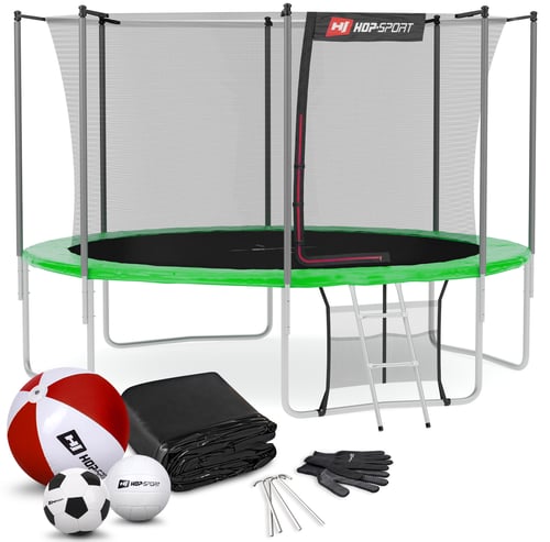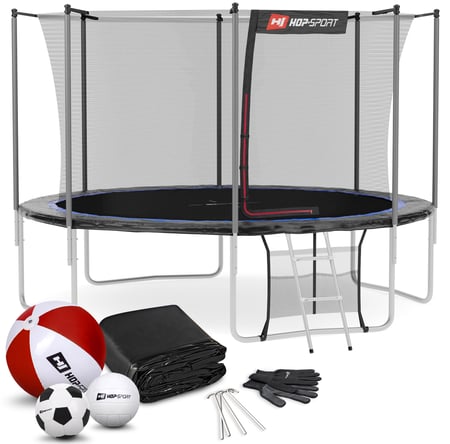 Het model van Hop-Sport onderscheidt zich door professionele afwerking en hoogwaardige kwaliteit. Om maximale veiligheid te garanderen, heeft de trampoline een volledig gegalvaniseerd stalen frame dat stabiel is tegen vervormingen en beschadigingen. Bij de levering ontvangt u ook een ladder, regenhoes, montagehandschoenen en grondhaken. Als dank voor uw aankoop hebben we bij elke bestelling een strandbal, volleybal en voetbal als gratis cadeau toegevoegd, zodat uw kinderen nog meer plezier hebben! De trampoline heeft het Intertek/GS-certificaat.